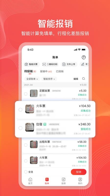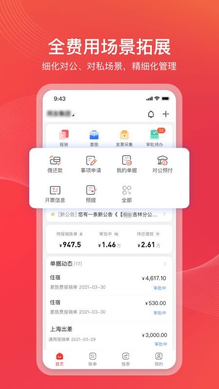 5、智能报销,采用智能的免填单、行程化差旅报销,及时了解报销的情况;
