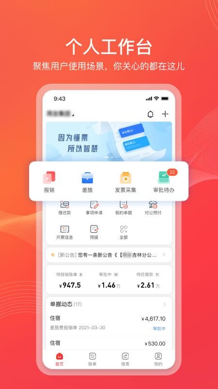 3、实时在线审批,提醒用户及时查看审批的任务,在线浏览报销并审批;