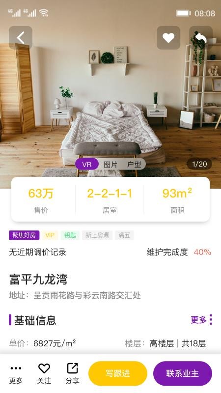 4、进入房源详情,查看详细的房源参数信息,和业主快速进行联系,一键关注房源