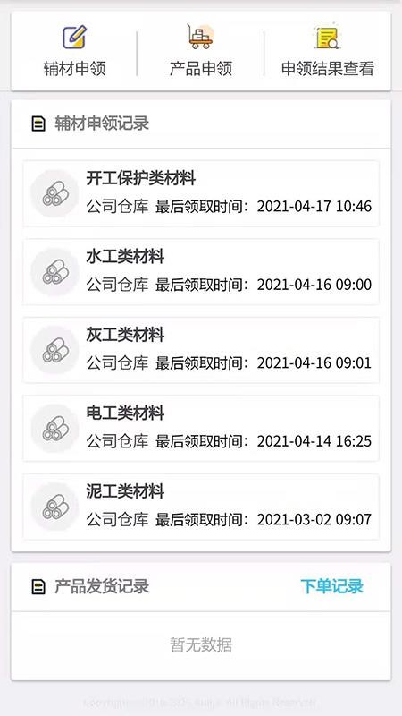 4、进入材料版块,快速申领各种辅材和产品,了解详细的辅材申领记录