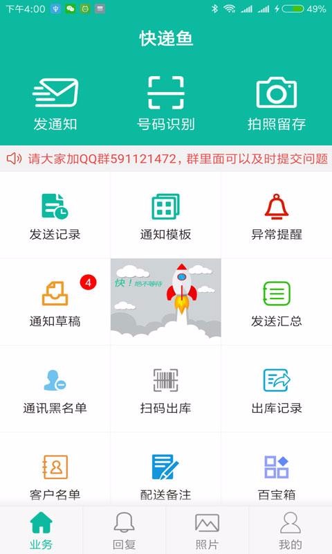 快递鱼是一个快递收发通知软件,主要为快递员们提供高效的办公服务,可以在这里发送短信通知、识别号码或拍照留存证据等;里面为用户开设了业务、回复以及照片管理中心,业务中给用户带来丰富多样的工作应用内容,适用于学校网点以及各大不同的商区自提点等场所,只要有短信快递通知需要就能轻松使用该软件来完成,针对该短信发送需求还设置了许多便捷的工具,采用精准的OCR技术,给用户提供极速识别的服务,让快递收发通知工作更高效;这里还为用户提供便捷的通知模板形式,也支持批量同时系统,加快了短信编辑速度,扩展了通知对象范围。