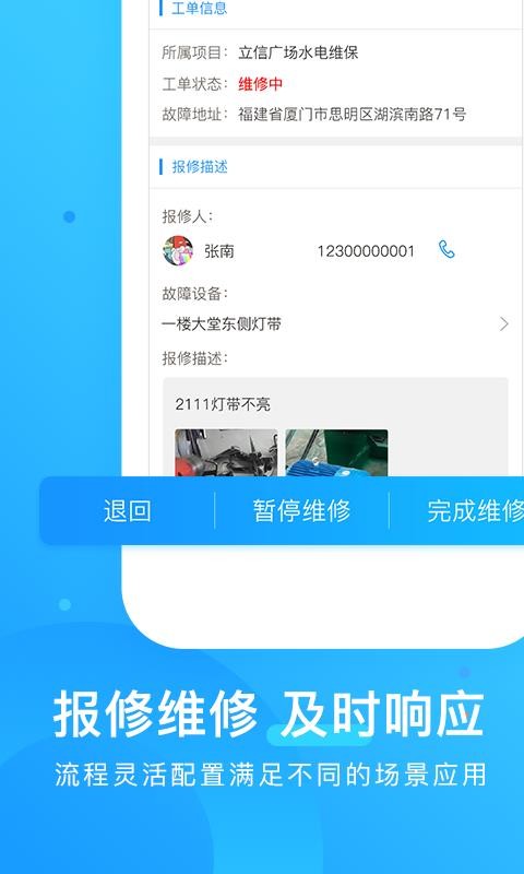 2、在首页中快速提交自己的各种报修内容,了解各个工单信息,及时完成工单