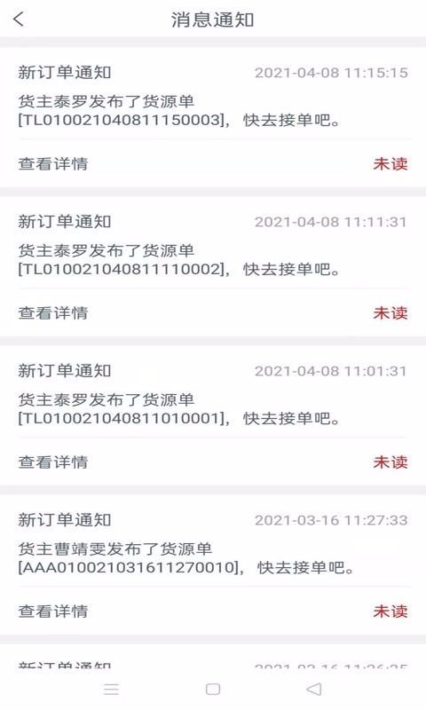 1、随时推荐最新货源进行通知,也显示货源类型,让司机及时接到新运单;
