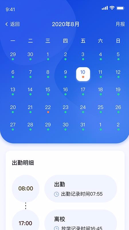 4、提供多种考勤查询方式,同时为用户提供了每天以及月报的考勤查看方式;