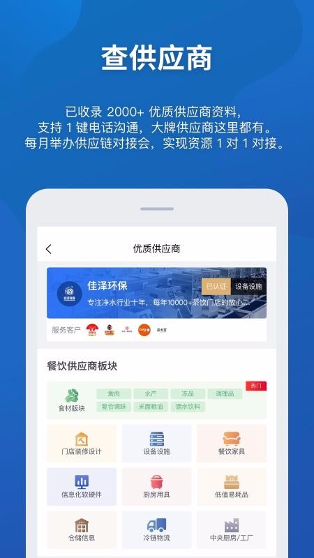 6、众多供应商类别资源,平台为用户汇集海量优质供应商,还划分了设备设施、餐饮家具以及冷链物流等类别;