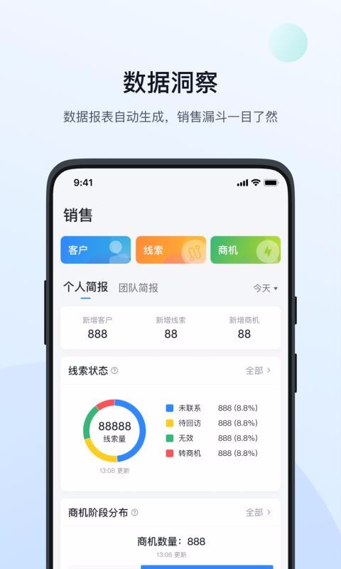 6、提供多种销售管理版块和图表数据,销售中心开设了客户、线索以及商机资源版块,还有清晰多样数据图内容;