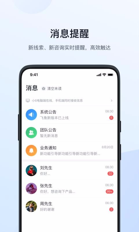 飞鱼CRM是一个营销管理软件,可以用于销售流程中整个环节的管理,支持对销售客户的分配、回访以及手动标记客户等;上面为用户设置了直达的客户消息沟通渠道,用户能在该软件中接收到来自客户的产品咨询信息,只需进入消息中心就能对这些消息内容一目了然,点击某消息即可打开查看消息详情,同时还能在线回复这些客户的咨询,及时抓住相应的销售商机;针对营销管理的团队新还专门设置了团队工作中心,里面为用户统计展示丰富的团队营销数据内容,通过这些数据能看到工作成果状态,通过这些信息内容可以做好相应的团队员工激励管理工作。