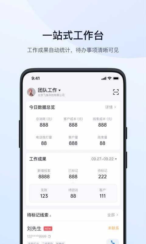 4、丰富的团队工作数据内容,团队工作版块中为用户提供今日数据总览、工作成果以及待标记线索数据版块;
