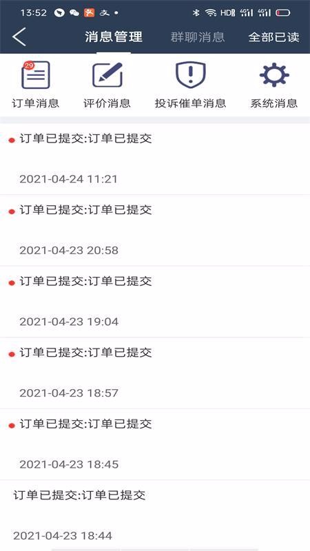3、实时推送新消息进行提醒,包括群聊消息、评价消息、订单消息、投诉催单消息等;