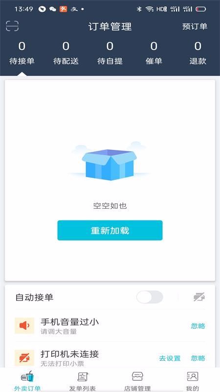 6、一键就可以开启自动接单,也可以按照提示设置手机音量、连接打印机等;