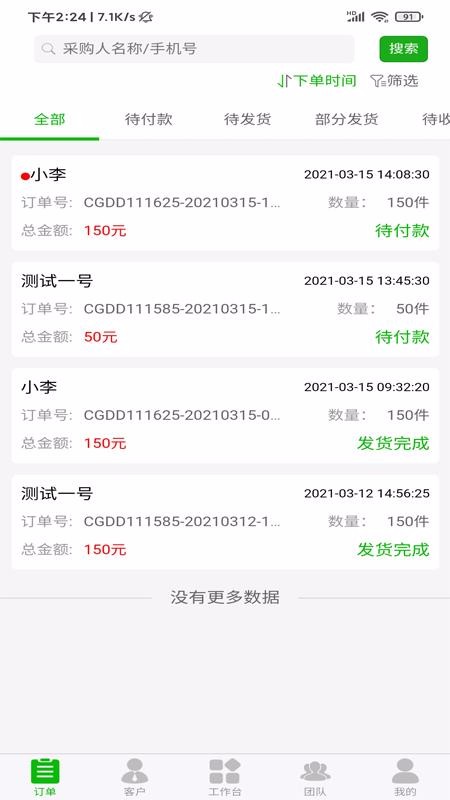 5、多种订单状态划分栏目,订单中心有待付款与发货,还有部分发货等状态栏目;