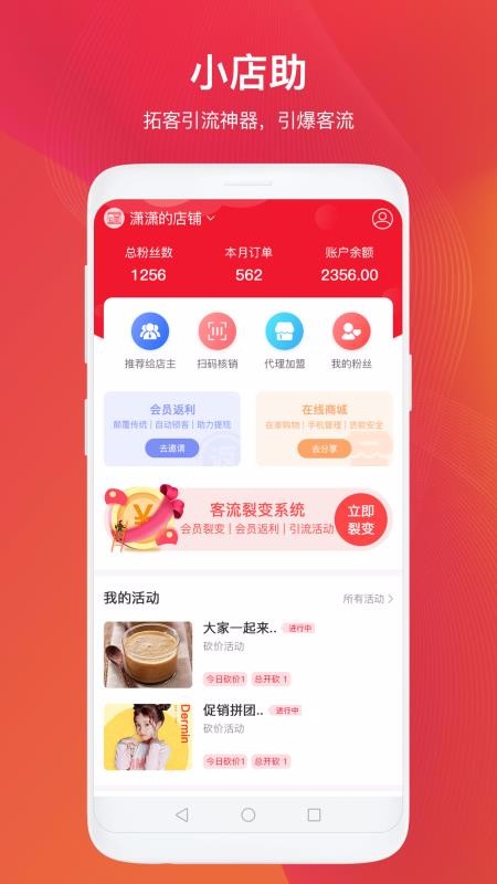 小店助是一个帮助实体店商家进行微信引流和销售的工具,可以让线下的商家创建专属的线上店铺,并通过创建各种活动在微信及朋友圈进行推广,从而实现更好的引流,也吸引更多的顾客到店消费,还可以让老顾客带动新顾客,最终帮助线下商家获取更多的营业额;所以,该软件是线下商家的拓客引流神器,为用户提供了多种营销工具,可以满足各种场景活动营销,比如有会员裂变、店铺分销、在线商城、转盘抽奖等,商家可以任意的创建活动、游戏等进行分享,从而汇集更多粉丝,也吸引更多人气,还可以辅助商家完成推广和拓客。