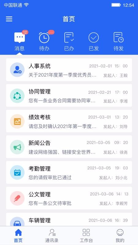 6、清晰的消息提示类型,消息栏目下会推送公文管理、车辆管理等消息,还有相应的不同图标划分展示;