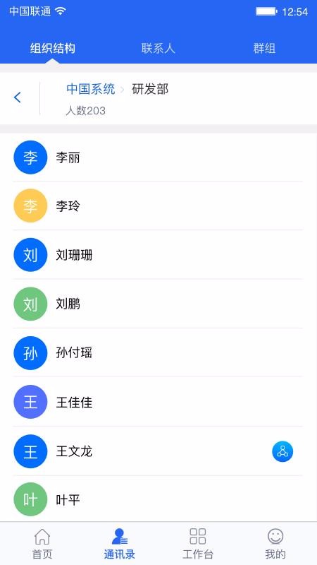 4、返回打开通讯录页面,点击组织结构并查看不同组织下的通讯录用户