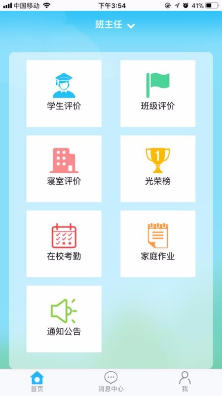 2、进入首页中,可以选择学生评价、在校考勤、家庭作业等功能进行使用