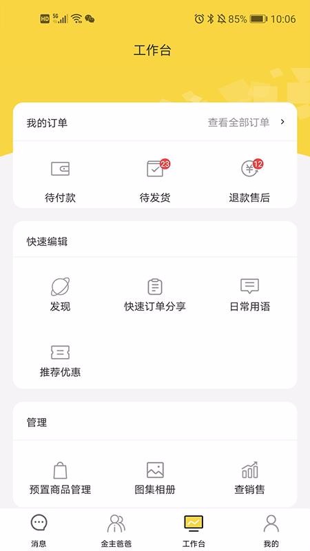 6、拥有丰富工作台功能,上面有订单管理、快速编辑管理和店铺管理基础功能版块;