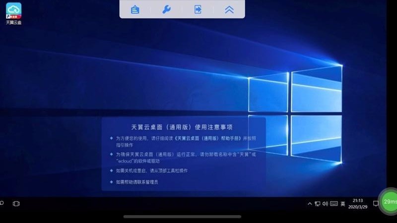 天翼云桌面通用版是一款电脑桌面展示软件,主要用于远程监控电脑桌面,在手机和电脑端同步安装相应的软件后,就能轻松连接并监控;一旦连接成功后就能获取进入电脑桌面的权限,同时还为用户设置了非常丰富的控制小工具,通过该工具栏能实时监控传输当前电脑的网速状态,该网络状态监控图标上实时展示当前的电脑网速信息内容;用户随时都能对进入或退出电脑云桌面,在软件封面展示了云桌面的相关参数标准,当用户进入后就能轻松控制电脑光标的显示状态,包括电脑中的虚拟键盘也能轻松控制。