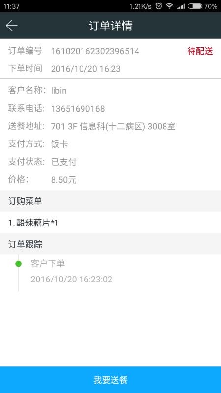 3、在这里,用户能够清晰看到收货地址和要求送达时间,及时进行送餐;