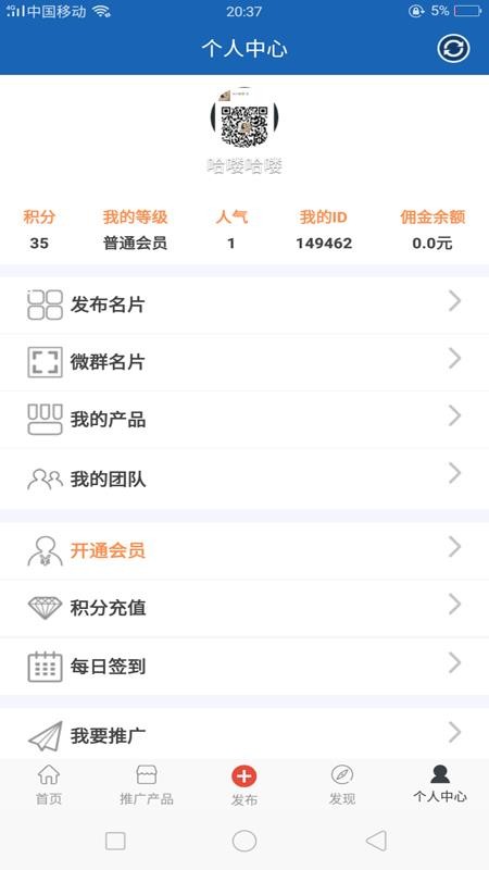 5、打开个人中心,一键发布自己的名片,了解自己的产品和团队信息,快速签到