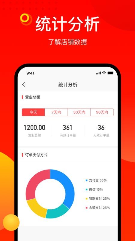 4、应用中有统计分析版块,帮助用户快速统计店铺的营业总额和订单支付方式比例详情;