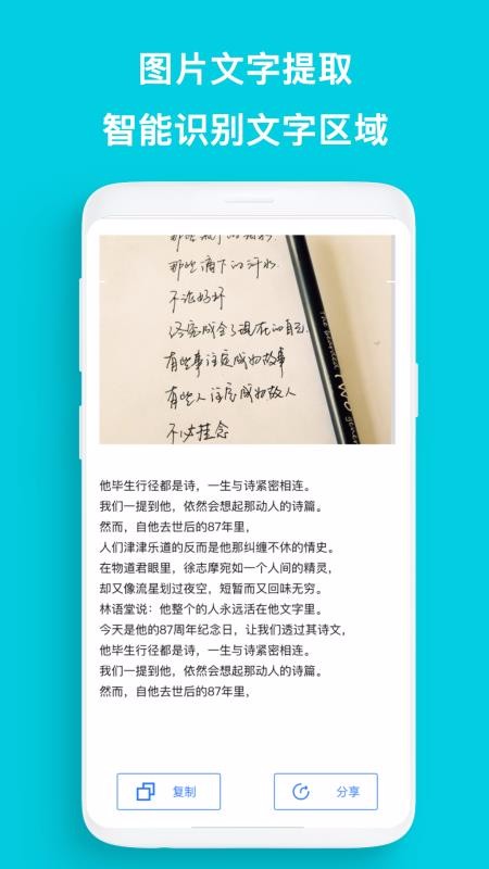1、便捷的识别结果处理工具,针对文字提取识别结果设置了复制和分享快捷功能;