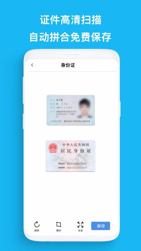 4、多种证件扫描处理功能,该扫描结构页面提供了旋转、裁切、全选和保存多种功能;