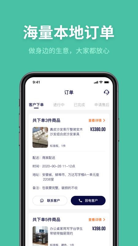 4、进入订单版块,查看不同类型的各种订单内容,快速和客户进行联系