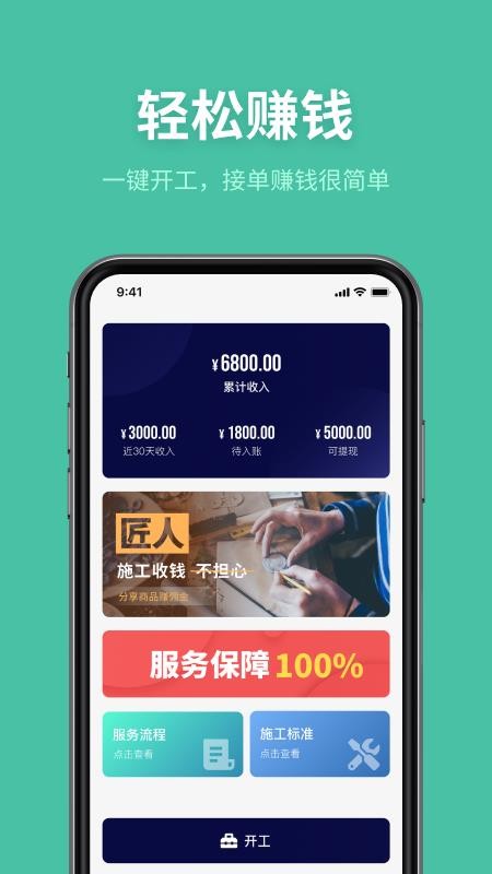 2、在首页中查看自己的详细收入信息,了解服务流程和施工标准,一键开工