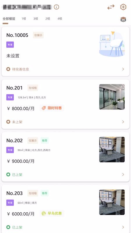 4、展示清晰的房源状态,所房源列表都展示了其待完善信息、未上架和已上架等状态;