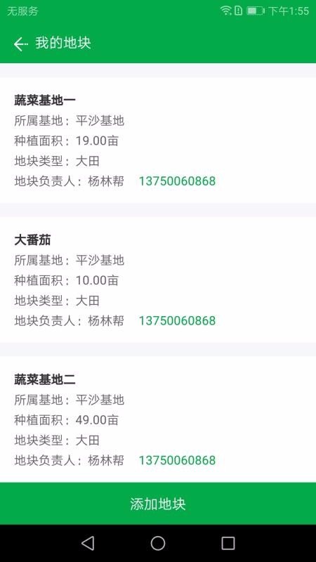 3、展示丰富的地块信息内容,其中有所属基地、种植面积以及地块类型等内容;