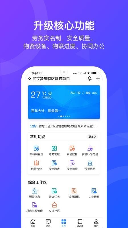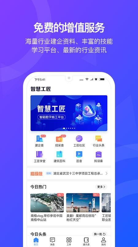 智慧工匠app是一款为建筑行业提供服务的工地管理软件,让用户能够更轻松的管理各个工程项目,提高自己的工作效率;用户在软件中能够看到各种类型的建筑行业相关信息,快速了解更多建企资料和技能知识,提高自己的工作能力,让工作变得更轻松,并且用户能够在这里找到多种类型的办公功能,帮助用户快速完成各种日常工作任务,保证各个工程的安全和质量,同时用户能够和其他人在线进行交流互动,讨论各种建筑行业话题,为自己的生活增添更多乐趣;快下载这款软件试试吧,了解更多行业资讯内容,学习更多建筑知识。