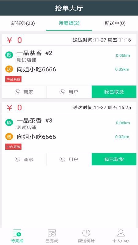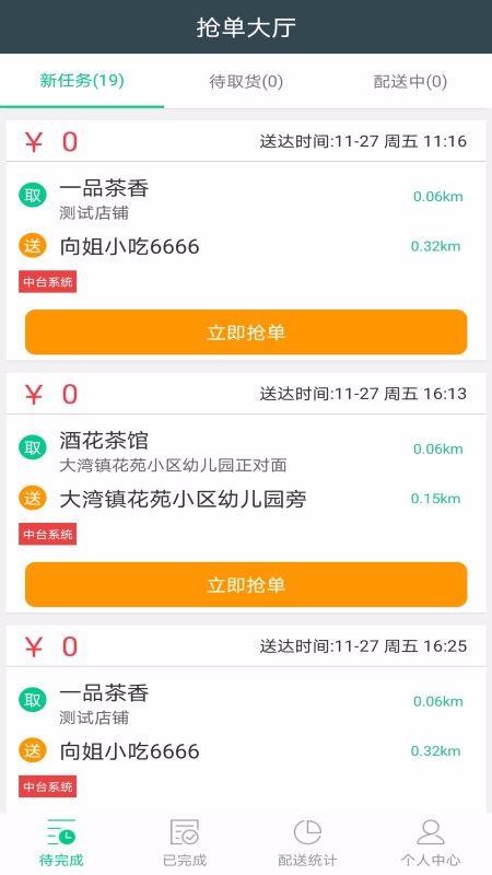 2、进入待完成页面,可以查看提供的抢单大厅,选择新任务、待取货或配送中的订单进行处理