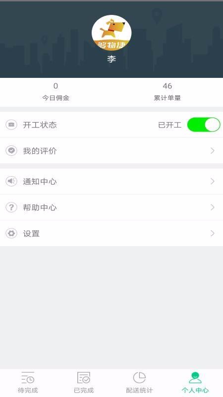 5、在个人中心,为用户展示了开工状态、我的评价、通知中心、帮助中心等功能信息