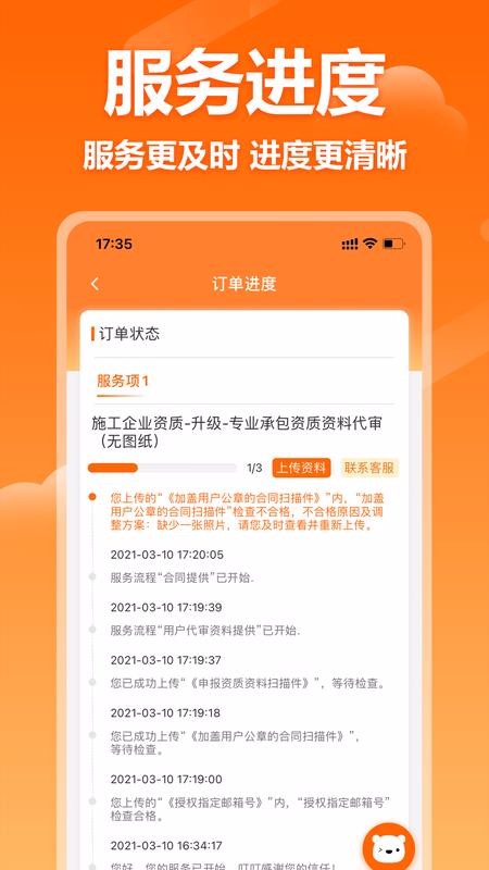 5、详细清晰的服务进度,给用户设置了订单中心,每个订单里面都展示详细清晰的进度;