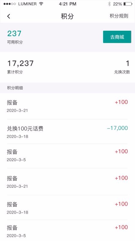 5、提供了积分功能,自动统计累计的积分数据,还可以查看积分的明细;