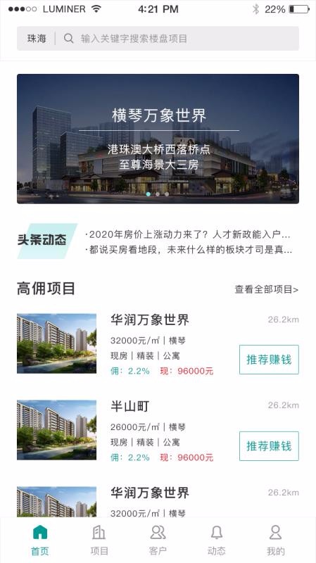 秒佣宝是专门为房产经纪人提供的报客神器和推广平台,经纪人可以在这里浏览到丰富的房产信息,并便捷的获取项目动态和资料,还可以选择合适的项目进行推广赚钱;轻松推广房源后,经纪人可以获得丰富的客户资源,在线就可以实现极速的报客跟进,还可以享受平台提供的佣金服务,从而给经纪人提供便捷的赚钱途径;所以,想要快速获得房产推广的佣金,就可以通过该软件进行查询和管理,平台也会随时推荐高佣项目,并标注了具体的佣金数据,可以让用户快速选择合适的房产进行推荐,成功推荐给客户之后,还可以赚取更多的收益。