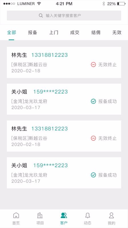 4、可以按照分类查看客户信息,并了解报备、上门、成交、结佣、无效等状态;