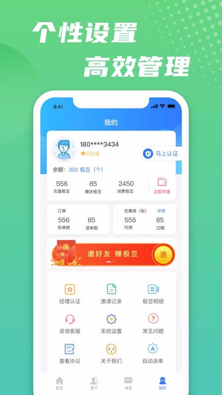 5、清晰多样的个人中心功能,这里有经理认证、邀请记录以及系统设置等功能;
