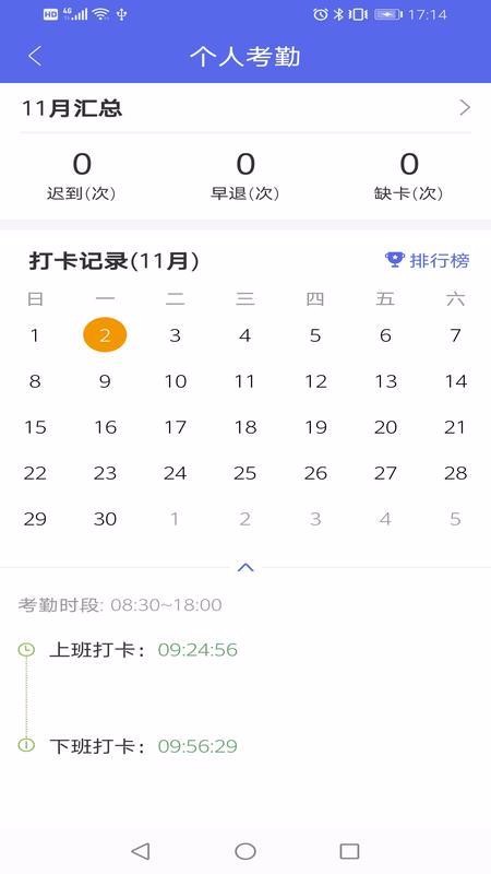 3、自动进行打卡汇总,可以查看每月的迟到、早退、缺卡等次数;