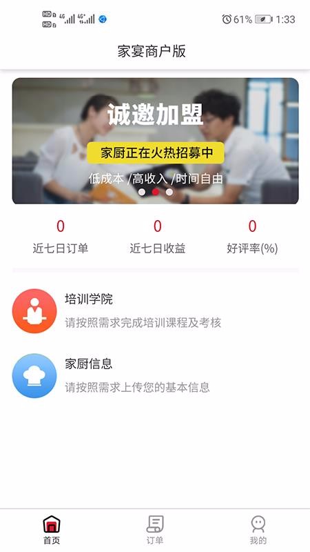 2、进入首页中,可以查看收入数据、订单数据、培训学院、家厨信息等功能
