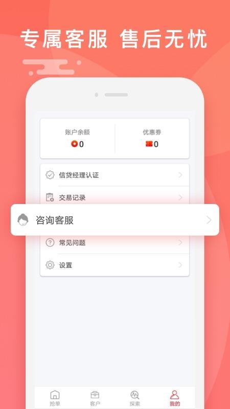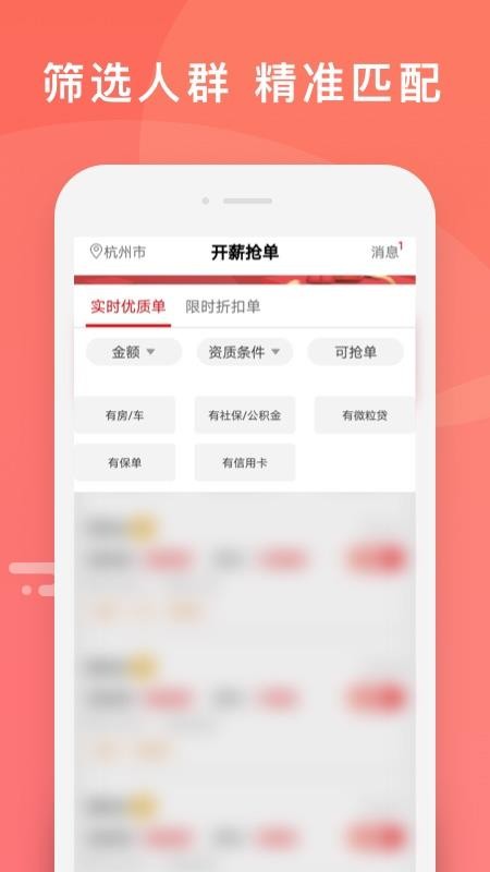 开薪抢单app是一款专业为信贷经理和信贷员打造的一站式展业获客平台,它每天为用户推送海量的订单,类型多种多样,涵盖了信用贷、微粒贷、房车、社保、公积金等等,可快速的选择查看,能够轻松的进行抢单,让用户再也不需要浪费精力去到线下寻找客户,有效的解决了信贷的获客难题;在这里,一键就可以迅速的抢单,会实时的对接取的订单进行跟踪,将订单的当前状态信息展现在用户的面前,让用户能够轻松的获取到客户的详细信息,在线就可以快速的进行管理,显著的提高了用户的工作效率;有需要的朋友赶快下载体验一下吧。