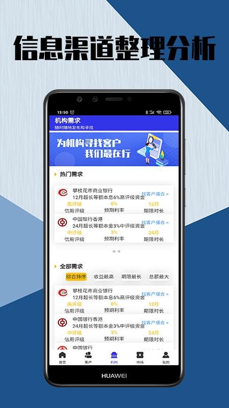 2、应用中有机构版块,用户可以看到各个机构的需求信息,快速为机构寻找客户;