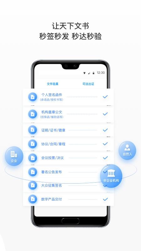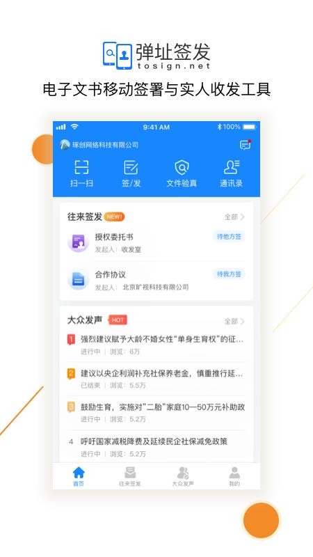 弹址签发app是一款专用于签发文件的软件,用户可在线将自己的签名上传,并快速的进行认证,认证成功后,就可以随时随地的签署各种类型的文件,包括了个人签名函件、机构盖章公文、数字产品交付、会议投票、证明、证书等等,能显著的提升用户的工作效率;在这里,整理了用户收到的各种文件,可自由的进行查看,并可使用原文比对、HASH校验、文件验签三种验真方式对文件进行验真,能够快速的确认文件的可信程度,让用户可以迅速的对文件进行签署,签署完毕后,就能将文件再发送给对方,再也不需要去到线下签署纸质文件,十分的方便快捷。