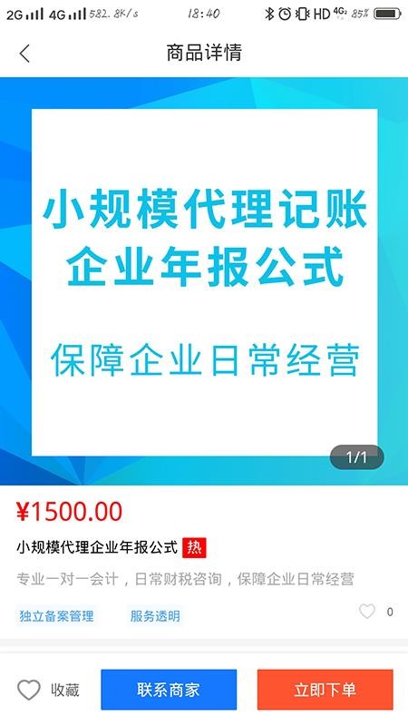 4、进入商品详情,查看各个商品的价格和主要服务内容,快速和商家进行联系