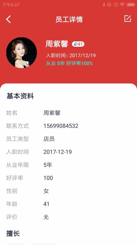2、支持编辑员工信息,涵盖了基本资料和擅长,也可以查看统计的从业年限和好评率;