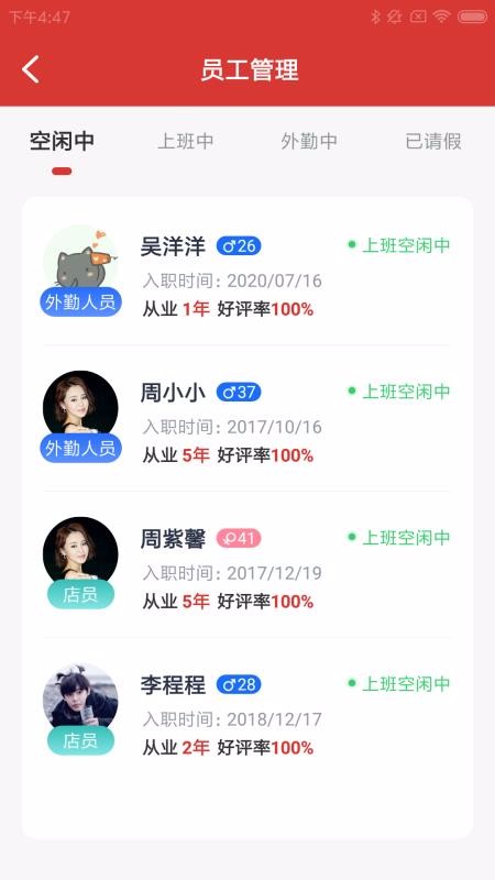 1、支持进行员工管理,便捷查看员工的工作状态,比如空闲中、上班中、外勤中等;