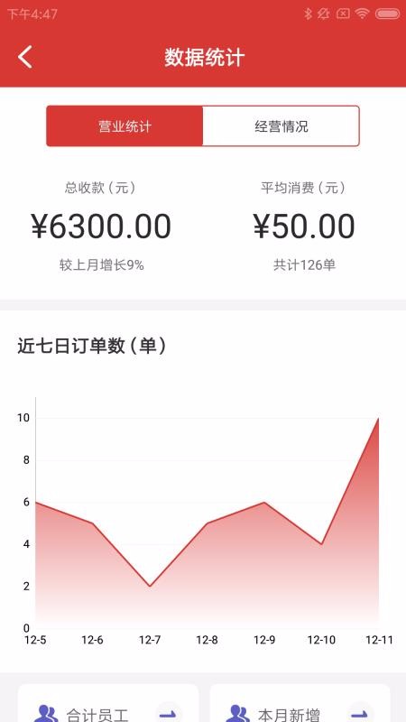 4、进入数据统计页面,可以查看提供的总收款、平均消费、合计员工、本月新增等数据