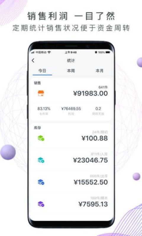 1、为用户提供统计版块,帮助用户统计今天的详细销售金额、利润金额等信息;