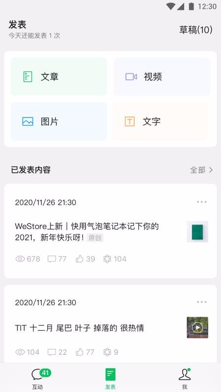 3、多种发表类型标签,发表中心给用户提供了文章、视频以及图片和文字的不同选择;