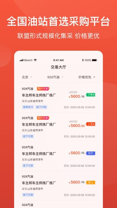 3、进入交易大厅,对各个交易信息进行筛选排序,快速采购各种油品